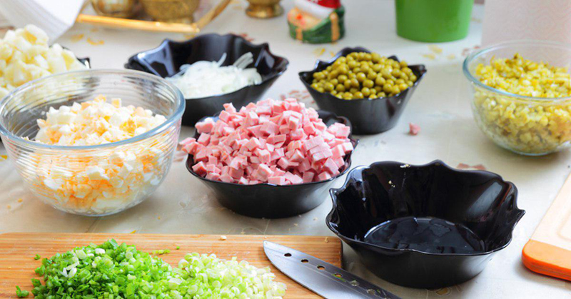 2. Filety z kurczaka, jajka, ziemniaki, marynowane pieczarki i szynkę pokrój w drobną kostkę. Ser zetrzyj na tarce o grubych oczkach.