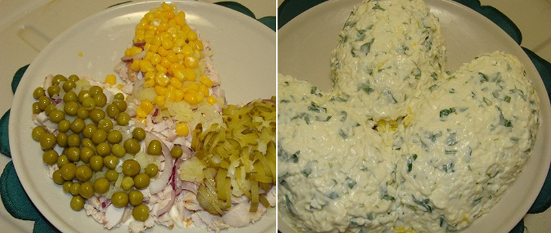 4. Pierwsza szyszka to filet z kurczaka, ziemniaki, kukurydza i jajka. Druga, to szynka, ziemniaki, ogórek, groszek i jajka. Trzecia, to marynowane pieczarki, ziemniaki, cebula, ser i jajka.