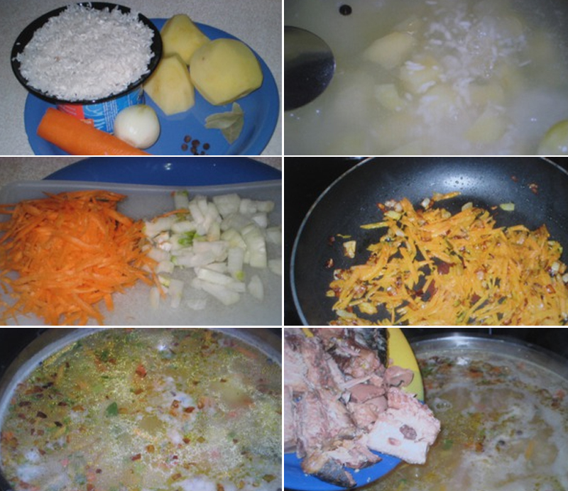 2. Do wrzącej wody, najpierw dodaj ziemniaki i ryż, posól do smaku. Marchewkę z cebulką pokrojoną w kostkę podsmaż na maśle.