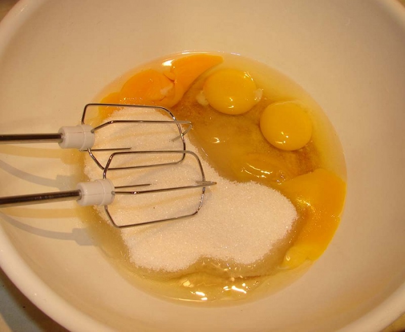 1. Z pomocą miksera ubij jajka z cukrem i cukrem waniliowym na jednolitą masę.