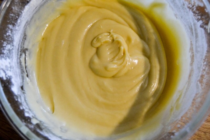 3. W osobnej misce, ubij jajka ze 150 g cukru i jajek. Delikatnie mieszając, dodawaj stopniowo stopione masło oraz suche składniki. Na koniec, dodaj masę cydrowo-śmietanową. Dokładnie wymieszaj, do uzyskania gładkiej i jednolitej konsystencji ciasta.