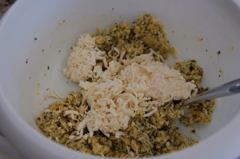 2. W miseczce wymieszaj bazylie, pietruszkę, oregano, bułkę tartą, czosnek oraz sól. Zatrzyj za pomocą tarki na dużych oczkach ser, dodaj go do przygotowanej mieszanki ,następnie wbij jajka i całość dokładnie połącz ze sobą.