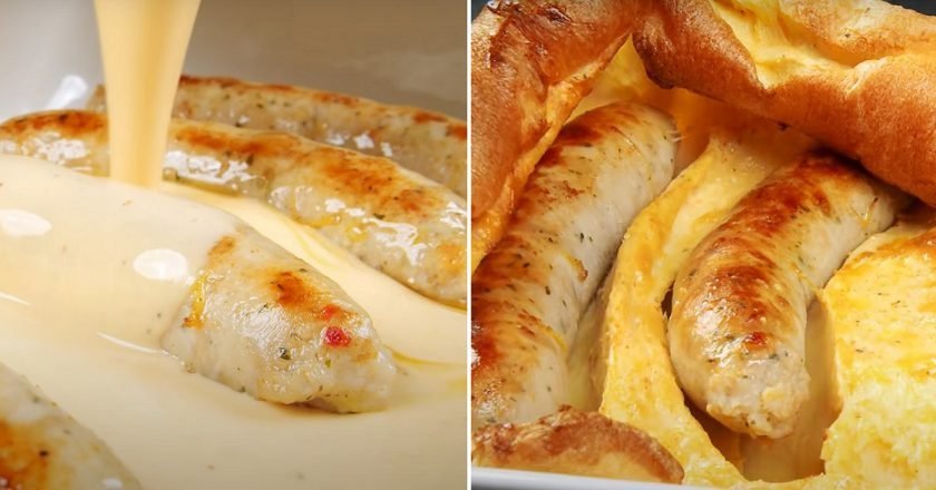 2. Do miski wrzuć jajka, mleko , wodę, chili, pieprz, sól i mąkę i wszystko dokładnie wymieszaj. Do żaroodpornego naczynia przełóż kiełbaski, następnie zalej gotowym sosem.