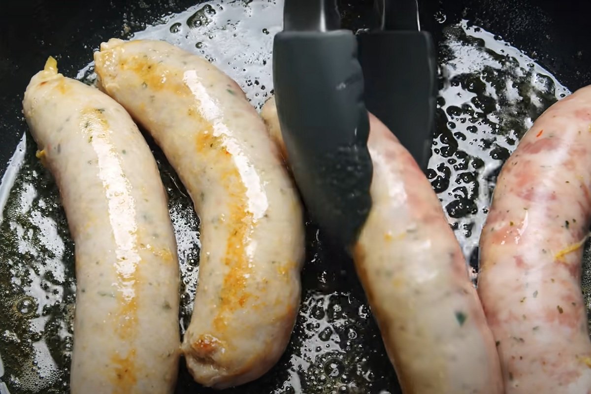 1.Na patelni rozgrzej masło, następnie połóż na nie kiełbaski i smaż na złoty kolor po obydwu stronach.