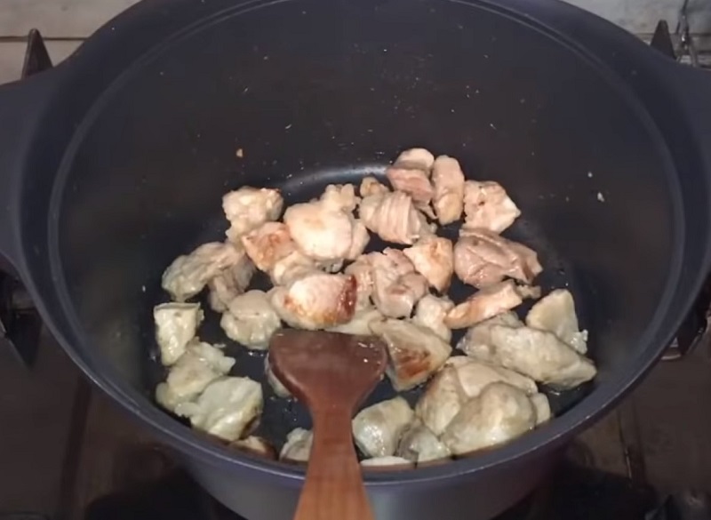 1. Dokładnie oczyść oraz umyj mięso wieprzowe, następnie pokrój w kostkę i smaż na patelni z dodatkiem oleju na złoty kolor.