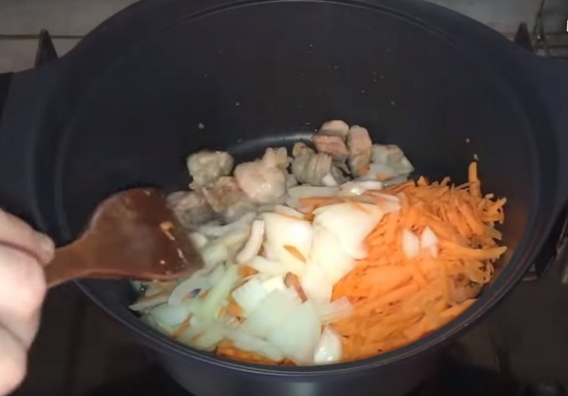 2. Pokrój drobno kapustę, następnie za pomocą tarki zetrzyj marchew na dużych oczkach, a cebulę pokrój w drobne piórka. Do podsmażającego się mięsa dodaj cebulę oraz marchew. Warzywa duś do momentu, aż całkowicie będą miękkie. Z patelni całość przenieś do większego garnka.