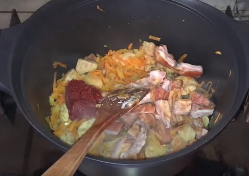 3. Na mniejsze kawałki pokrój wędzone żeberka, następnie przełóż je do garnka. Dodaj koncentrat i przypraw do smaku solą. Całość dokładnie wymieszaj.