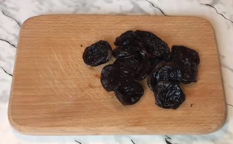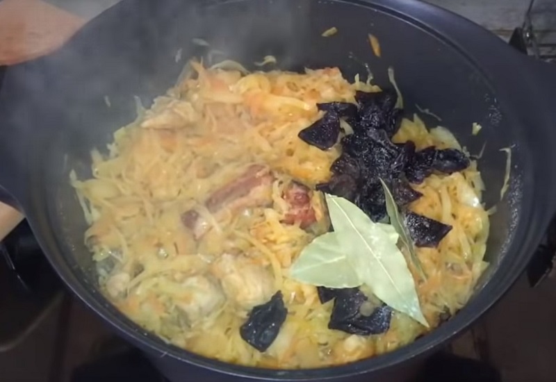 5. Przez około pół godziny gotuj bigos pod przykryciem na małym ogniu. W miedzy czasie zaparz suszone śliwki gorącą wodą. Po jakimś czasie pokrój wszystkie śliwki na małe kawałki.