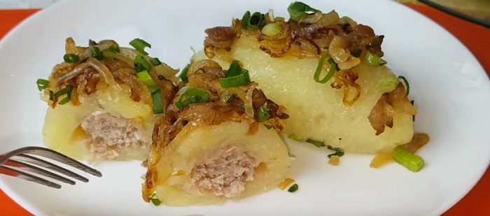 6. Zmocz dłonie w zimnej wodzie i uformuj owalne kluski, przypominające cepeliny, zawijając w środku porcję mięsnego farszu.