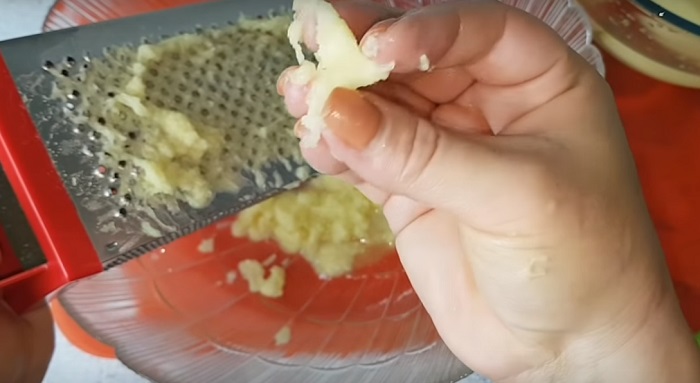 2. Surowe ziemniaki zetrzyj na tarce o drobnych oczkach i odciśnij wodę ze skrobią. Nie wylewaj, będzie ci potrzebna.