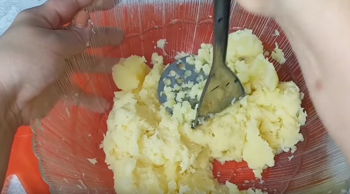 3. Ugotowane ziemniaki przeciśnij przez praskę i szybko dodaj do surowych startych ziemniaków.