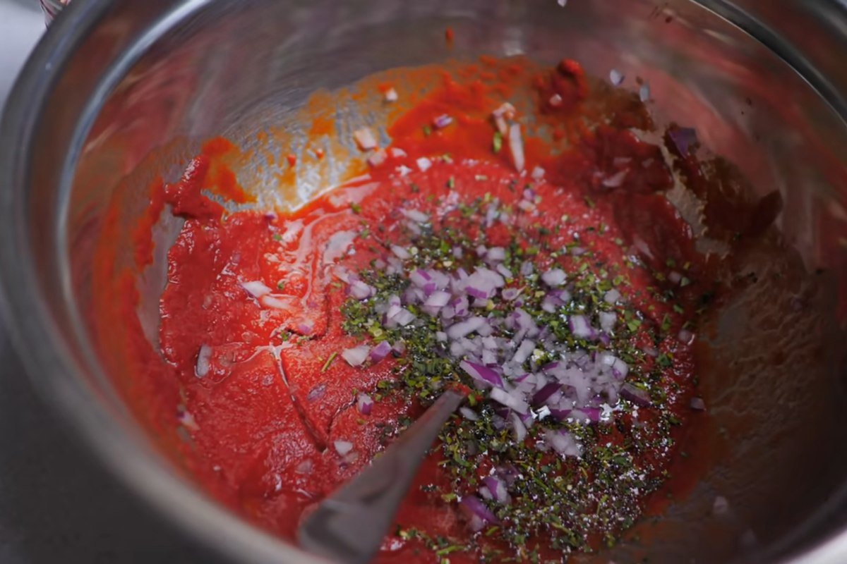 1. Zacznij od przygotowania sosu: W misce, wymieszaj koncentrat pomidorowy, wodę i olej roślinny. Następnie dodaj drobno pokrojoną cebulę (0,25), cukier, zioła i pieprz. Dobrze wymieszaj.