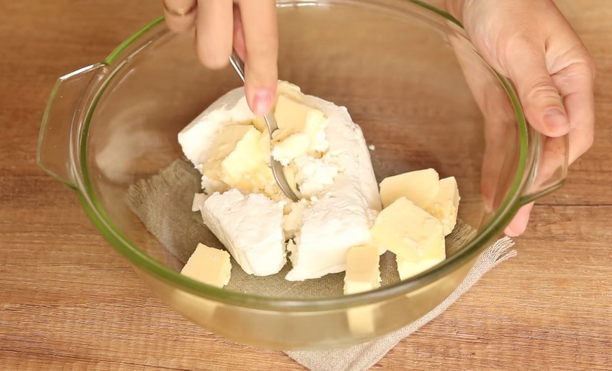 1. W dużej misce, rozgnieć widelcem twaróg, a następnie dodaj sól i miękkie masło, pokrojone w kosteczkę.