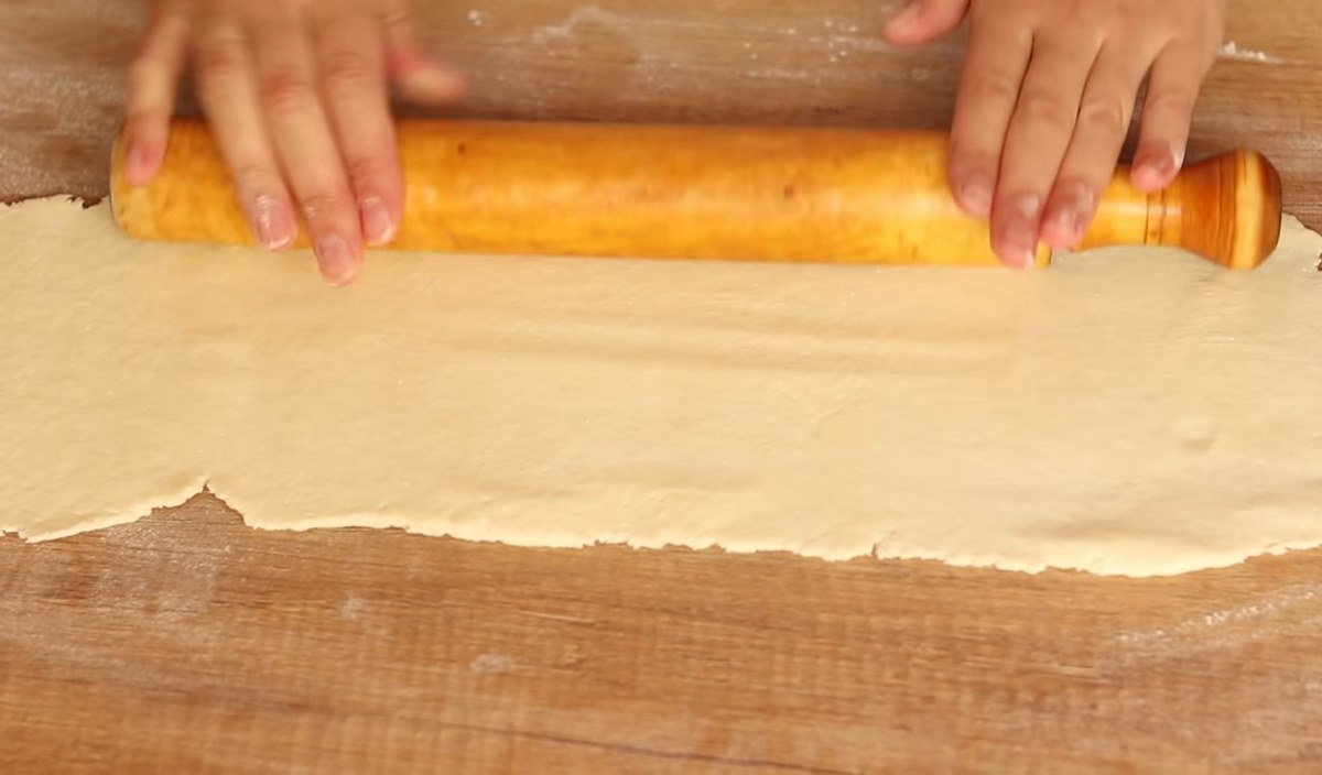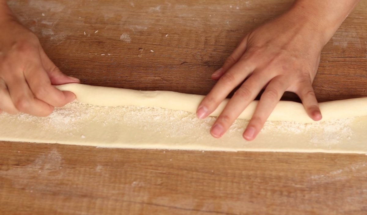 8. Zwiń w ciasne ruloniki i pokrój je na mniejsze ok. 5 cm. kawałki. Poukładaj je na blaszce, wyłożonej papierem do pieczenia.