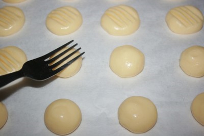 4. Teraz spłaszcz każdą kulkę widelcem, będą miały ładny i unikalny wzór na wierzchu.