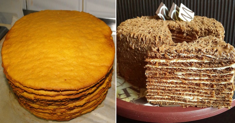 9. Pozostaje tylko złożyć w całość nasze wspaniałe ciasto. Aby to zrobić, rozłóż bitą śmietanę z czekoladą na każdym cieście, łącząc je ze sobą i przykryj górę niesmarowanym ciastem.
