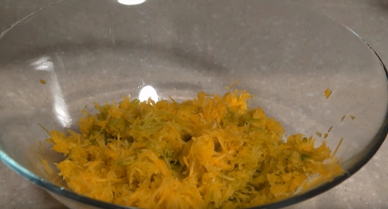 1. Zetrzyj obraną dynię na tarce o drobnych oczkach lub z pomocą blendera. Dodaj kefir, 100 g cukru, kaszę mannę, proszek do pieczenia i skórkę z jednej cytryny. Dokładnie i szybko wymieszaj wszystkie składniki, aby kasza manna nie zdążyła spęcznieć.