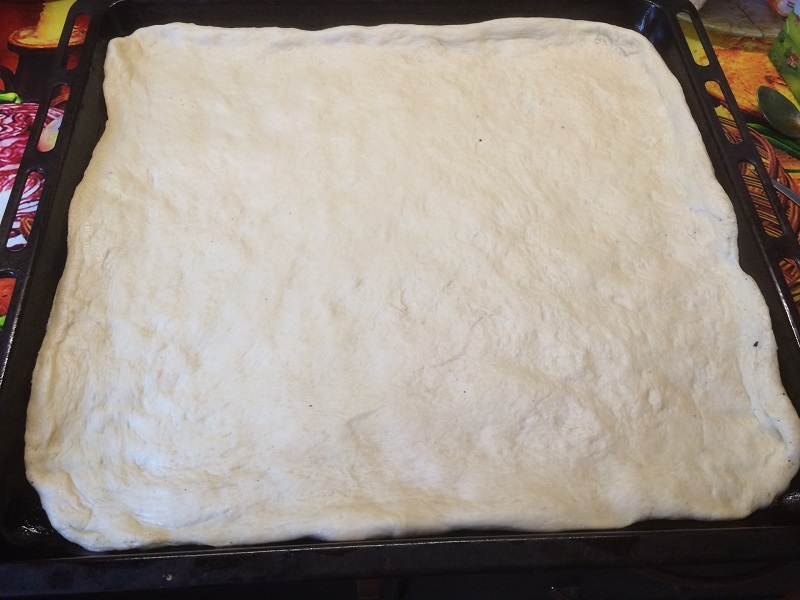 5. Kiedy ciasto odpocznie, rozwałkuj je do wielkości nieco większej niż blaszka do pieczenia.