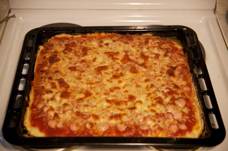 Na przygotowane w ten sposób ciasto, możesz położyć kiełbasę, pieczarki, pomidory, ser lub inne produkty, które znajdziesz w lodówce. Potem wystarczy tylko upiec.