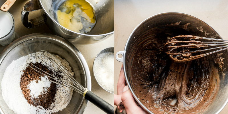 3. W osobnej misce, ubij jajka mikserem na małych obrotach, stopniowo dodając cukier, cukier waniliowy i roztopione masło. Na koniec dodaj kefir i mieszaj mikserem do połączenia się składników na gładką i jednolitą masę. Teraz połącz ze sobą zawartość obu misek i wymieszaj.