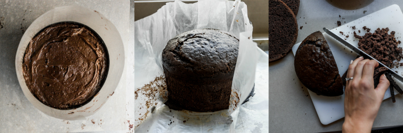 5. Ostrym nożem odetnij 2 cm górnej części ciasta i zblenduj, a pozostałe przekrój na 3 równe części.