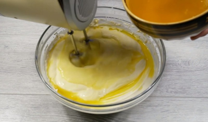 2. Teraz, do masy stopniowo dodawaj galaretkę, na małych obrotach nie przerywając miksowania. Formę, wyłóż folią spożywczą, na jej spodzie poukładaj ciasno herbatniki i zalej masą serową.