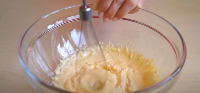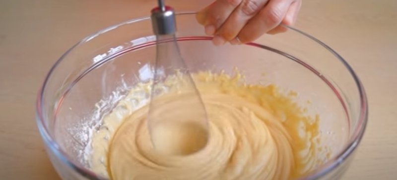 Żółtka należy ubić z cukrem, roztopionym masłem, mlekiem, solą oraz cukrem waniliowym. Do tak powstałej masy dodać przesianą mąkę oraz proszek do pieczenia i wszystko dobrze wymieszać.