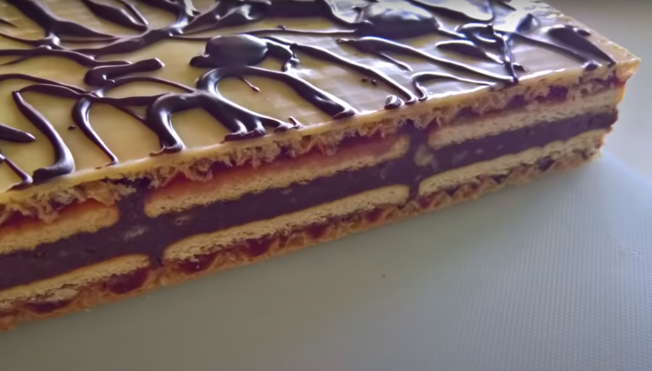 4. Gdy całość stężeje ułóż kolejną warstwę wafli, dżemu i herbatników. To wszystko, ciasto jest gotowe. Wstaw na kilka godzin do lodówki, aby masa lepiej stężała.