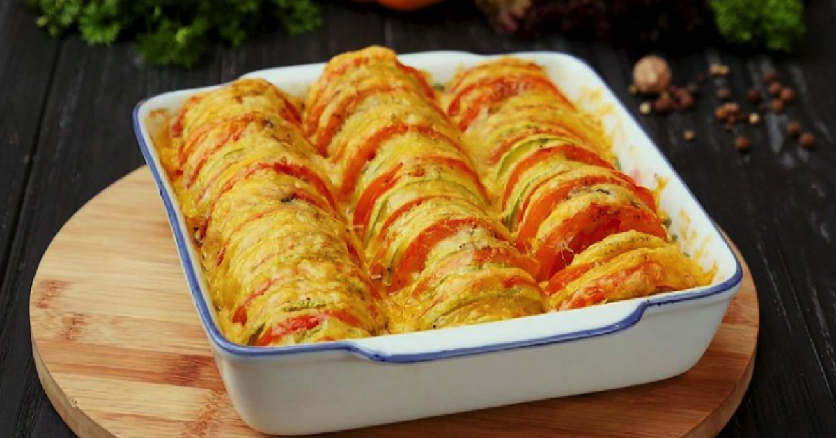 2. Umyte i obrane wcześniej ziemniaki, cukinię i pomidory, pokrój w plastry. Następnie, ułóż warzywa warstwami w naczyniu żaroodpornym z cebulką.