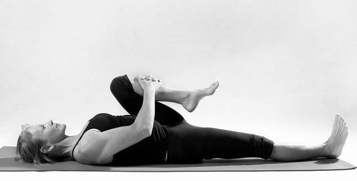 Połóż się na plecach, po czym jedną nogę zegnij i podciągnij di klatki piersiowej. Następnie rozłóż ręce tak, aby dotykały one podłoża. Takie ćwiczenie wykonuj na zmianę .