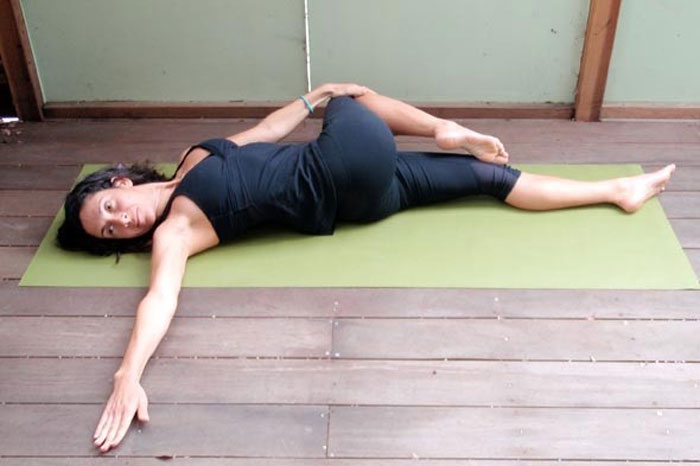 Połóż się na plecach, po czym prawą rękę połóż na bok, następnie ugnij lewą nogę i odciągnij ją na prawą stronę. Wytrzymaj tak minutę po czym zmień nogę.