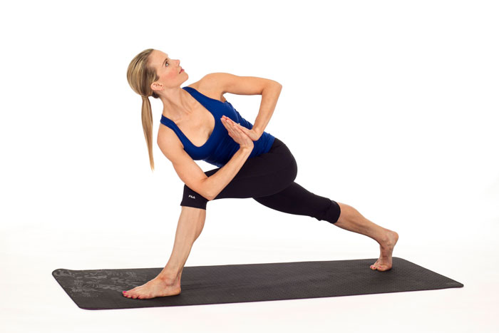 Zrób krok do przodu lewą nogą, natomiast prawą wyprostuj do tyłu i oprzyj się na czubach palców stopy. Tułów lekko odwróć, następnie na lewym kolanie połóż prawy łokieć, a dłonie złącz ze sobą. Pozostań tak przez 30 sekund. Po upływie czasu zmień nogi.