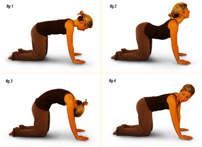 Tego typu ćwiczenie koniecznie wykonuje się na czworaka. Cały ciężar ciała koniecznie przenieś na ramiona. Przez dwie minuty wypychaj lub zginaj tułów. Gdy wypychamy kręgosłup do góry, koniecznie głowę opuść w dół tak jak na zdjęciu poniżej, a w przypadku obniżania na dół kręgosłup , głowę koniecznie podnoś ku górze.