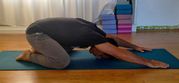 Takie ćwiczenie zaczyna się wykonywać od pozycji klęczącej. Rozsuń kolana na szerokość bioder, po czym usiądź na piętach, a ramiona wyłóż do przodu. Koniecznie pozostań tak przez pół minuty, pamiętaj aby odpowiednio oddychać.