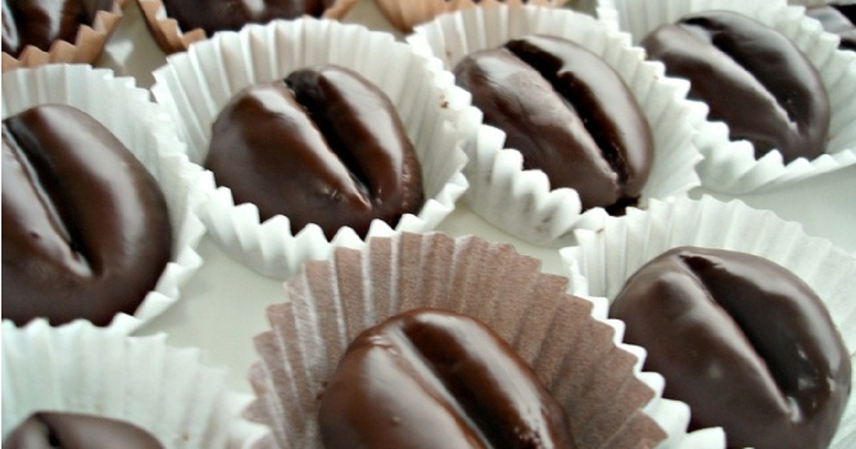Na blaszce wyłożonej papierem do pieczenia układamy nasze „ziarenka kawy” i polewamy dokładnie czekoladą. Smacznego!