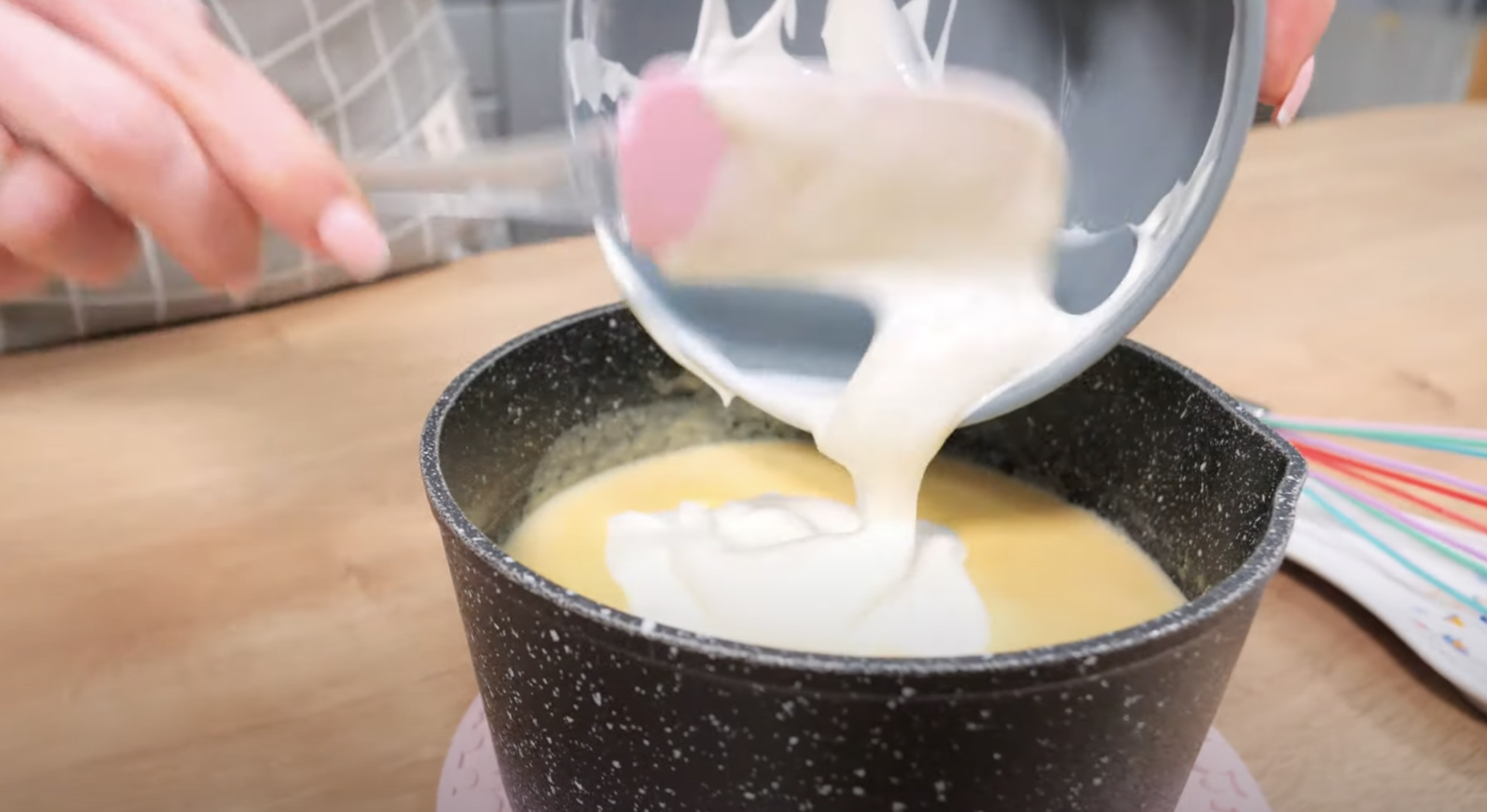 Po zdjęciu z ognia – dodać żelatynę, wymieszać całość, wraz ze śmietaną, cukrem oraz masą jajeczną.