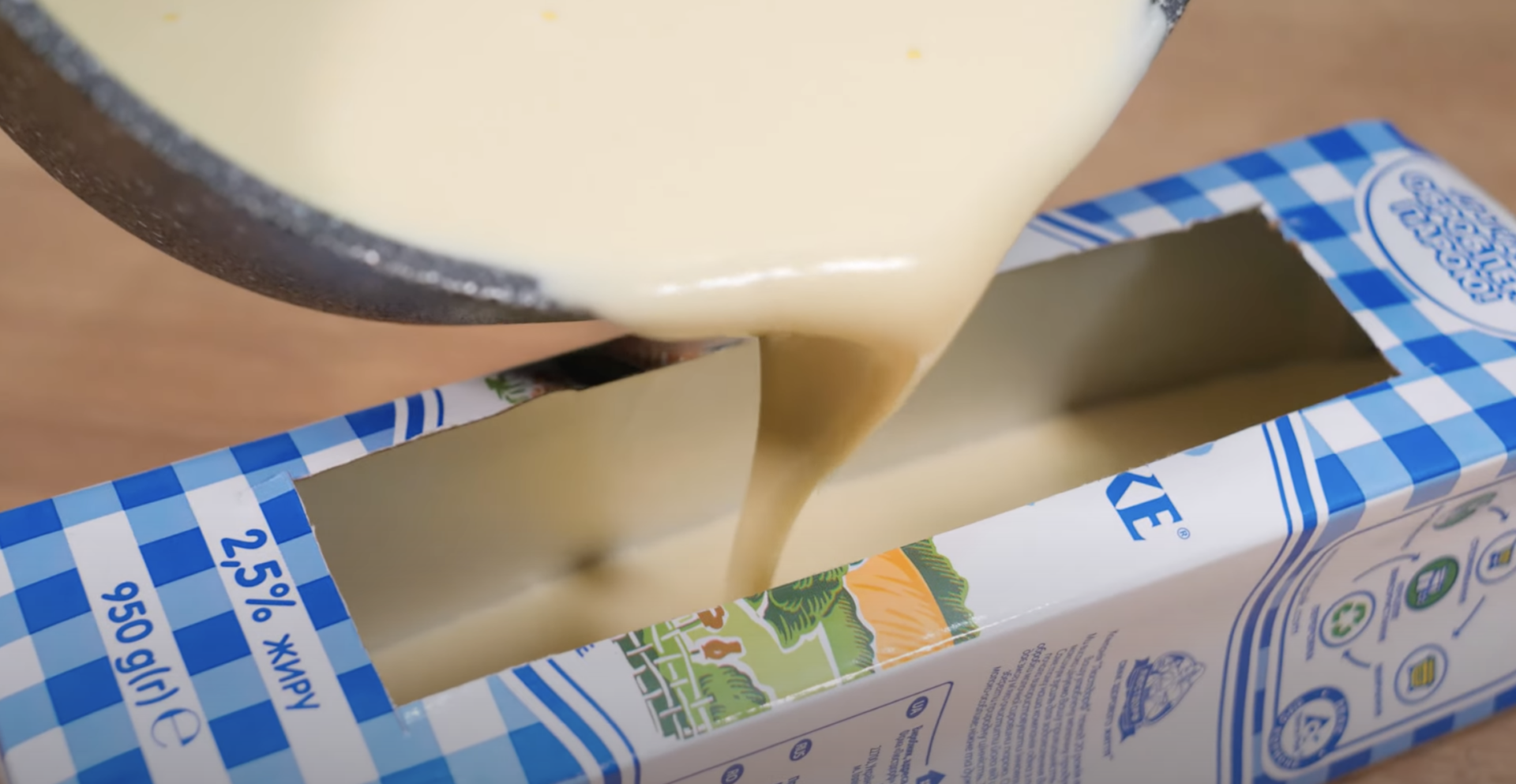 Wszystkie składniki wlać do pustego i czystego kartoniku po mleku, od którego wcześniej należy odciąć górną część (tak jak na poniższym zdjęciu). Zawinąć w folię i pozostawić do ostygnięcia w lodówce,