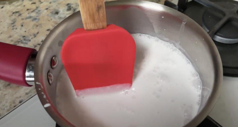 Mleko kokosowe podgrzewamy na małym ogniu, nie dopuszczając do wrzenia.