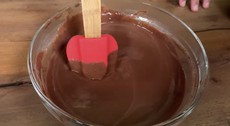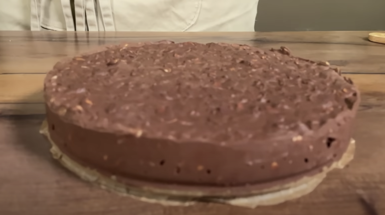 Tak przygotowaną masę czekoladową przekładamy do foremki o średnicy 18 centymetrów. Wyrównujemy wierzch, dokładnie zakrywamy folią spożywczą i wstawiamy do lodówki na co najmniej 3 godziny lub do czasu, aż deser stwardnieje. Przed podaniem kroimy na niewielkie porcje.