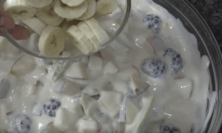 Dowolne owoce pokrój na małe kawałki i dodaj do swojego deseru. Można także dodać pokruszone herbatniki lub biszkopty i układać na przemian ze śmietaną i owocami w miseczce deserowej. Deser smakuje najlepiej, gdy jest trzymany minimum kilka godzin w lodówce, najlepiej całą noc.
