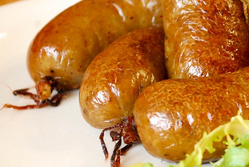 5. Wymieszaj składniki z ziemniakami. Wypełnij ściśle jelita masą ziemniaczaną. Zwiąż mocno końce i nakłuj w kilku miejscach każdą kiełbaskę wykałaczką.