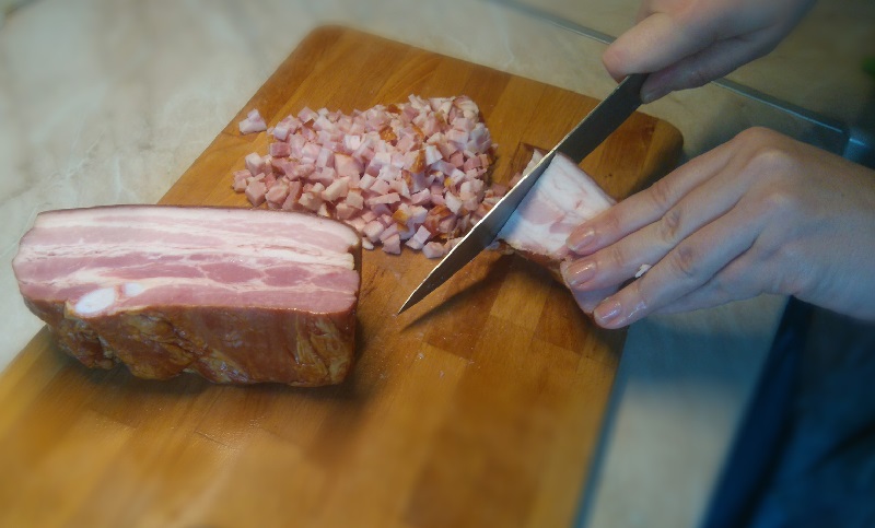 4. Pokrój pieczarki i podgardle (lub boczek). Dodaj do cebuli i smaż, aż się zarumieni.