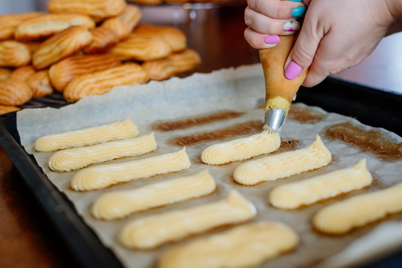 7. Wyciskaj ciasto z rękawa piekarniczego na blaszkę, na której wyłożony jest papier do pieczenia. Piecz w piekarniku nagrzanym do 200 stopni C przez 22 minuty.