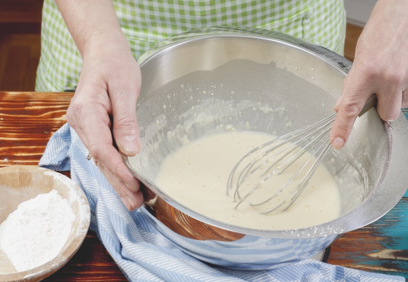 3. Dodawaj stopniowo mąkę, dobrze wymieszaj aby nie było grudek. Ciasto powinno być nieco gęstsze niż ciasto na naleśniki.