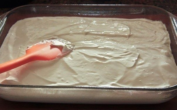 4. Wlej gotową masę do formy. Spróbuj wygładzić powierzchnię, aby była równa i włóż do lodówki. Nie zapomnij przykryć formy folią spożywczą.