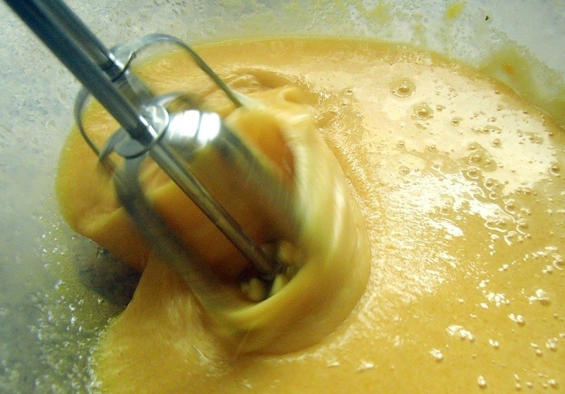 3. Możesz użyć miksera lub blendera, aby masa była jednolita i gładka. Następnie dodaj przesianą mąkę i ponownie dobrze wymieszaj. Możesz również dodać orzechy lub rodzynki. Twoje ciasto jest gotowe.