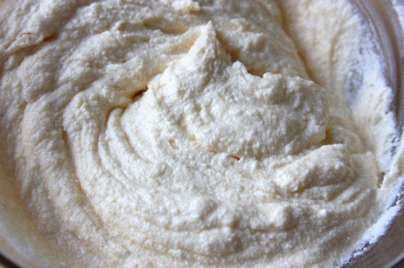 2. Dodaj śmietanę do ubitych jajek, twaróg i roztopione masło, potem sól i sodę. Wszystko dokładnie wymieszaj.