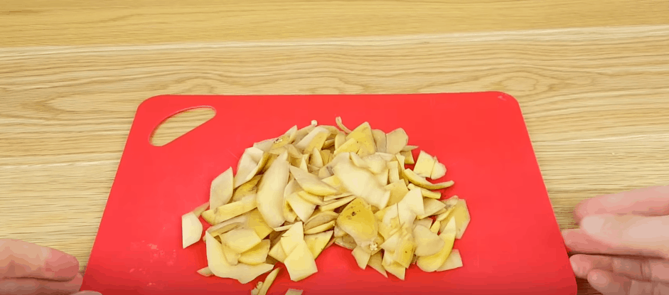 Na małe kawałki pokrój wszystkie skórki z obranych ziemniaków.