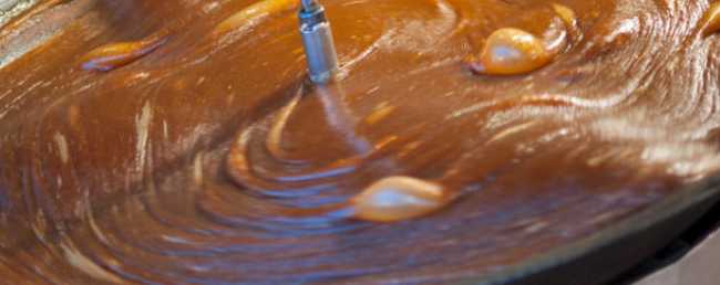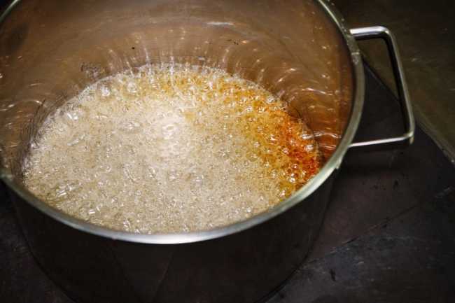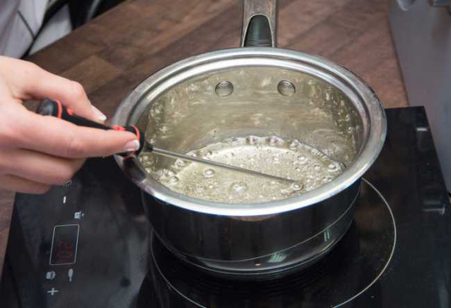 - Do garnka wlej wodę i wsyp cukier. Następnie gotuj powstałą mieszankę umieszczając w garnku termometr. UWAGA! Nie można mieszać karmelu, ponieważ powoduje to powstawanie kryształów, które będą tworzyć się w miarę ochładzania karmelu, co może prowadzić do ziarnistości. Doprowadź swoją wodę z cukrem do dokładnie 170 stopni. Zmieni się na ciemny bursztynowy kolor. Następnie natychmiast usuń z ognia.