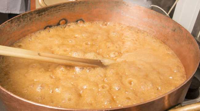 - Zdjąć pokrywkę i kontynuować gotowanie, aż mieszanina cukru będzie miała głęboki bursztynowy kolor i osiągnie 170 stopni na termometrze cukierniczym. Czas gotowania to około 10 do 15 minut.
